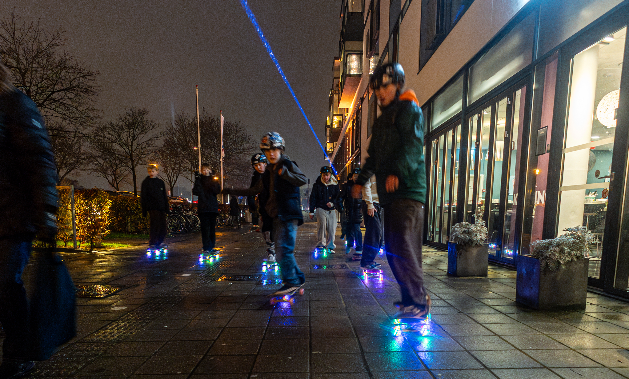 Kl.18.00 Skater vi i gågaden med vores skateboard som har lysene hjul. og laver små konkurrencer